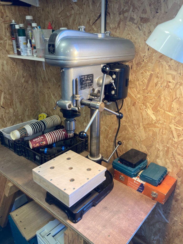 This FOBCO Star drill was built by F.O’Brian of Swadlincote, probably in the 1960s. The company built just two products over 40 years, the 4-speed Star and the heavier 7-Eight. The head is cast iron and weighs 70Kg, the drive pulleys are balanced so the drill runs with barely any vibration and just a gentle hum. This one has been restored by a retired tool-maker in Wakefield so it’s in beautiful condition. The heavy looking table allows me to clamp onto a square frame to ensure the wood doesn’t move and is square to the drill. It’s a common modification for woodworking.