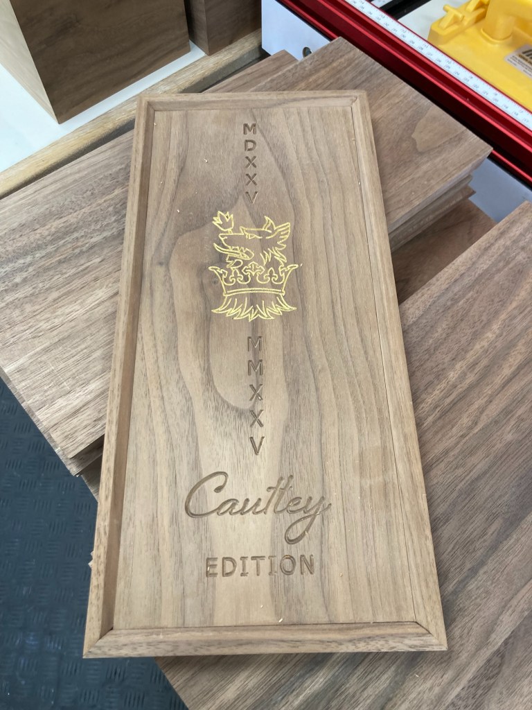 I have been working with Anne’s godson who is a prototype engineer working with CNC machines. A near neighbour who specialises in painting Russian orthodox icons is highlighting the CNC work with gold leaf and a saddle-maker friend has made some beautiful bridle leather coasters for each box. I’m in the process of assembly and finishing. It’s exciting to see them coming together and I’ll post more about them in due course.