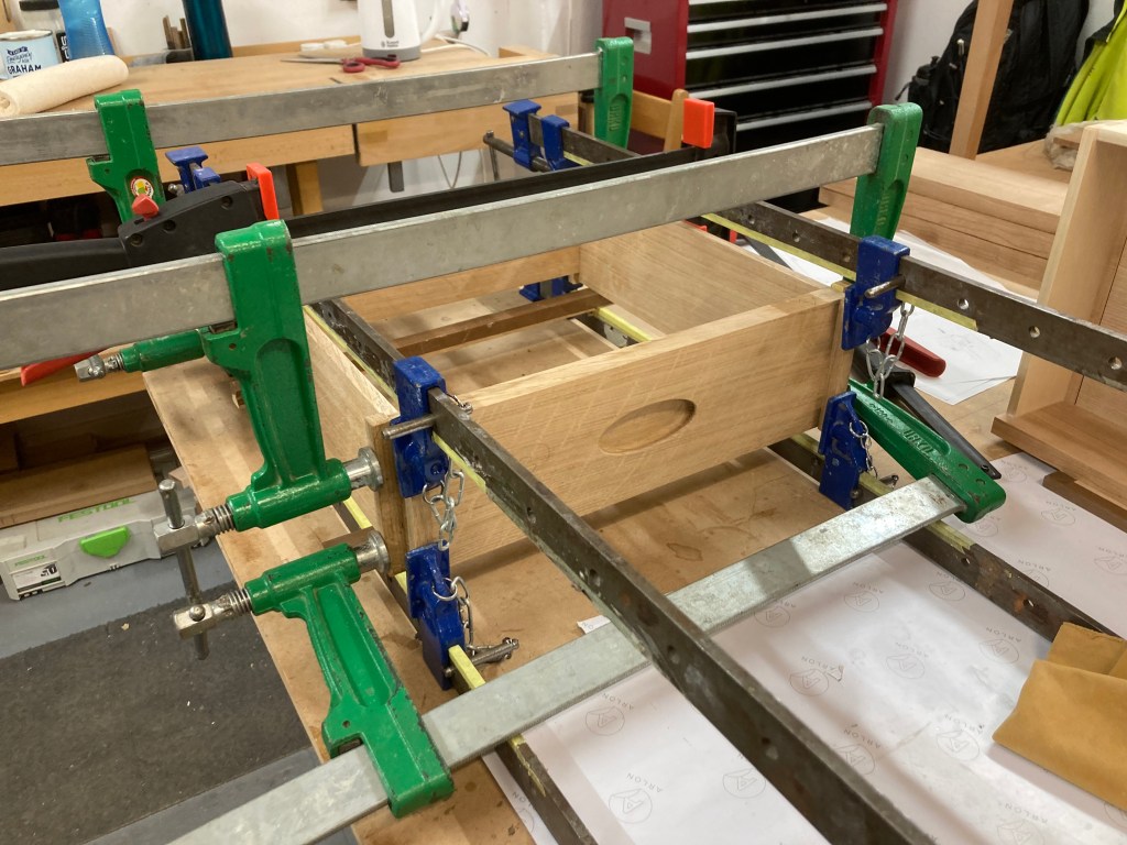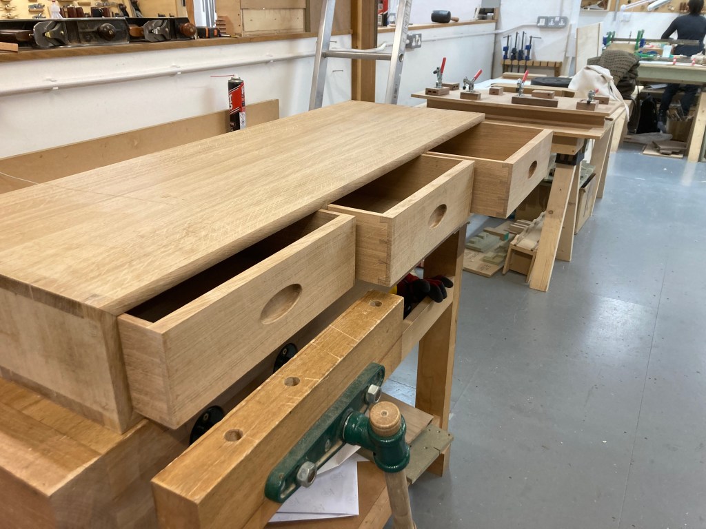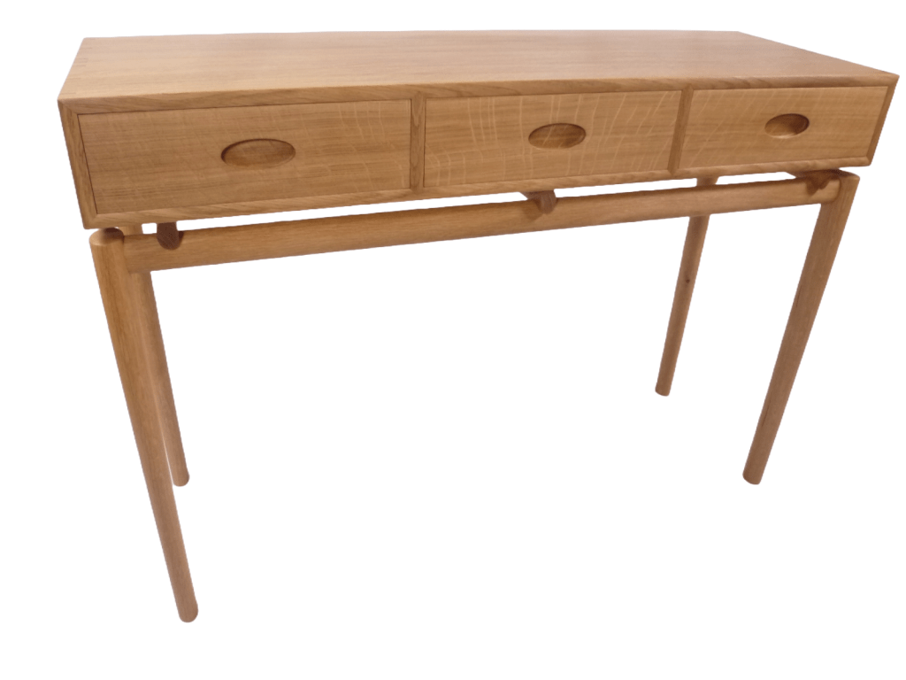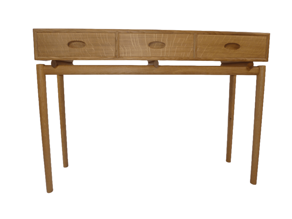 Some weeks later, I developed the elliptical theme and with the outline of a design established, visited the woodyard where I found a piece of quarter-sawn oak with beautifully symmetrical medullary rays. These became an important decorative feature across the drawer fronts. The elliptical theme continues in the tapered legs.