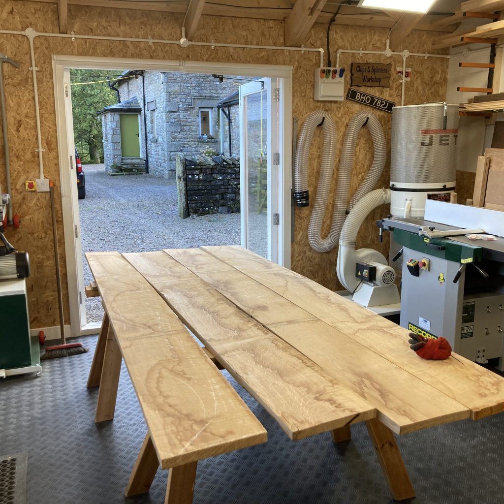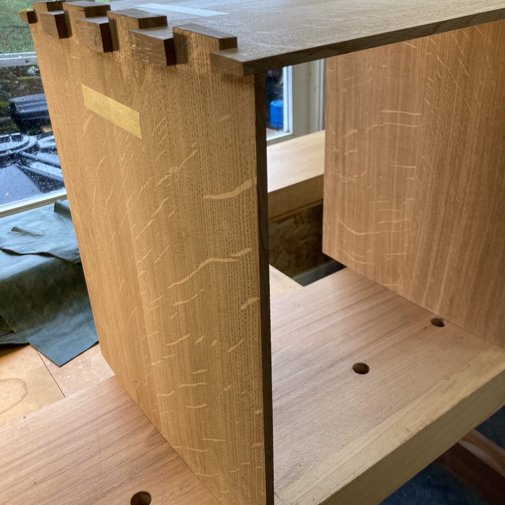 Some leftover oak became warped and I wondered how to use the awkward wood. An impromptu design session emerged on the back of an envelope. If I could incorporate the curve of the board, I could use more of the timber. It worked well on the convex side and I squeezed more thickness out to mirror the same profile underneath by sacrificing some width. As the form crystalized in my mind, the problems emerged. The dovetail joints must echo the curve of the boards and with no plane of reference make accurate marking a challenge. Their decorative function provides no opportunity to hide mistakes.